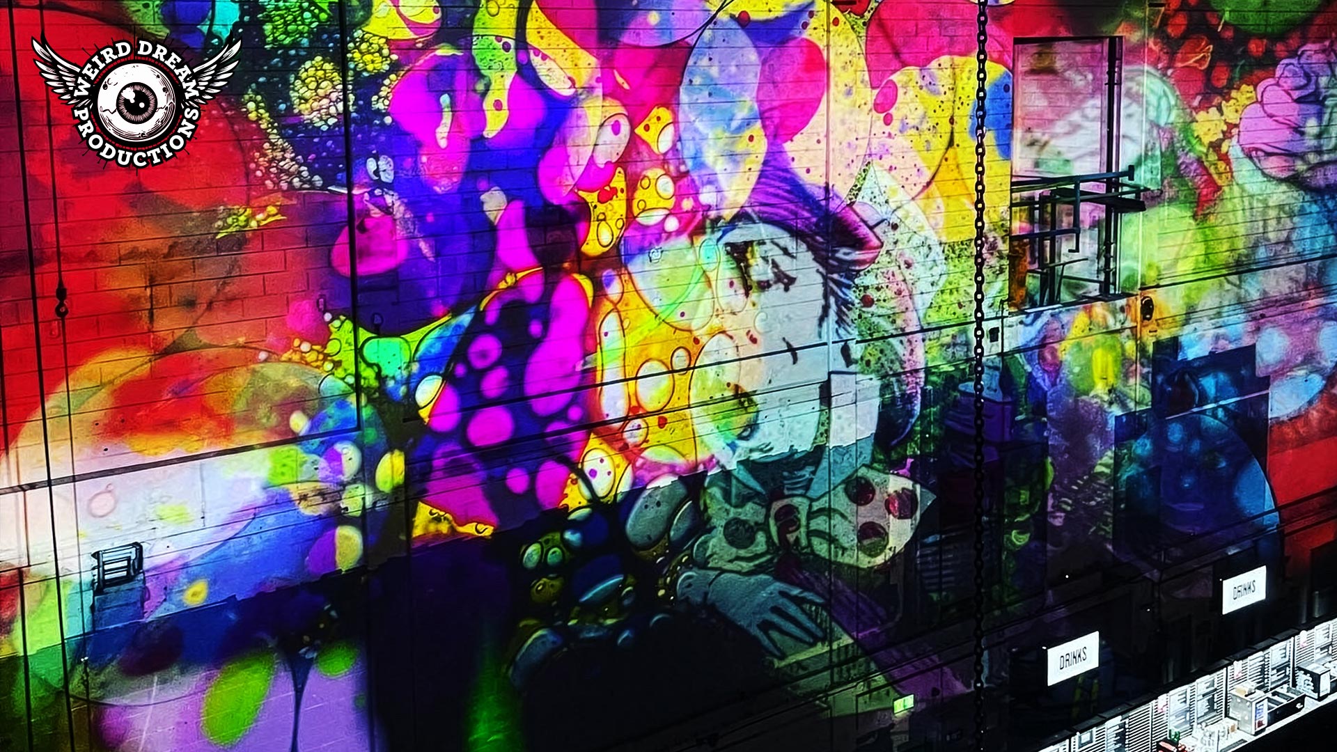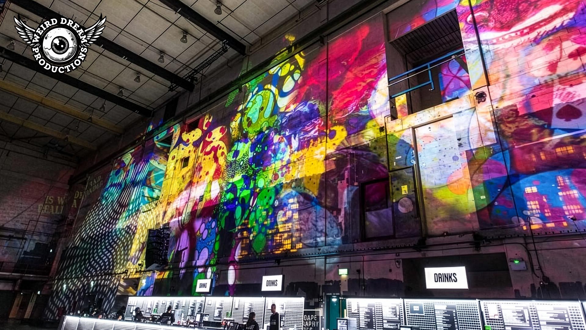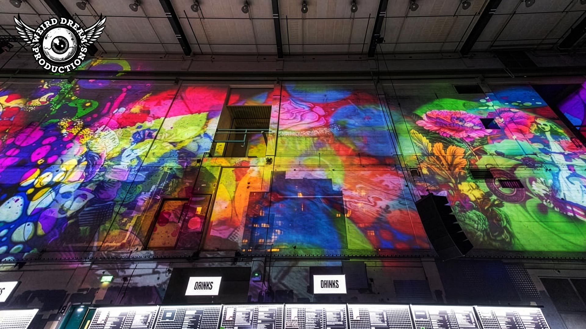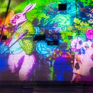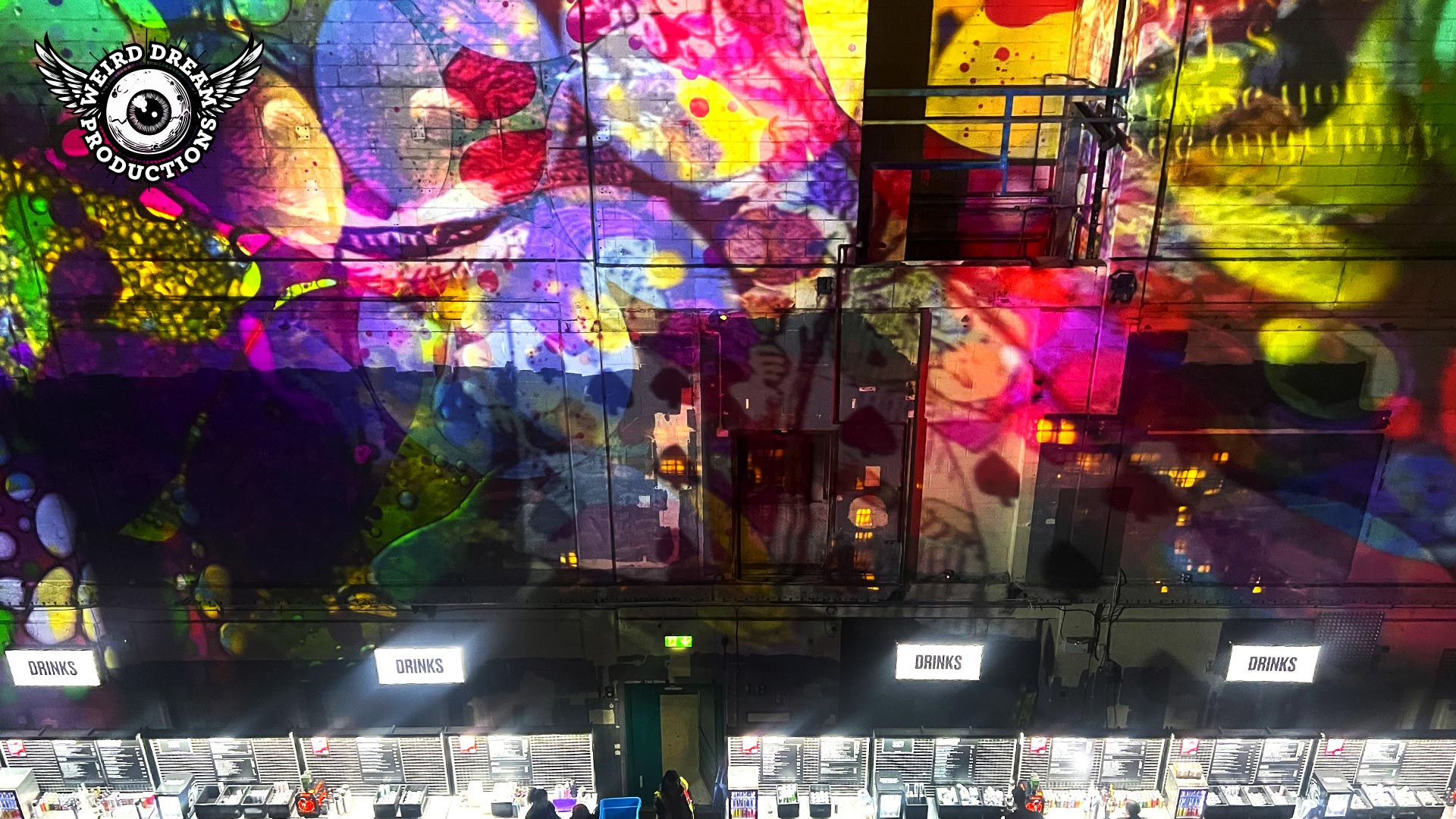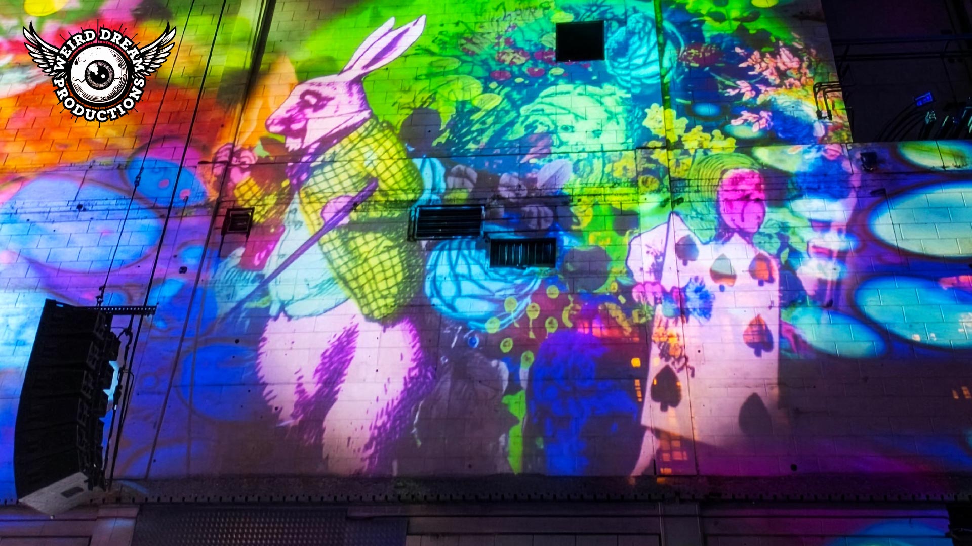 Our mission? Turn industrial grit into full-blown Wonderland. Lava-lamp oil projections spilled across the vast walls, constantly morphing and melting, then collided with scenes from Alice’s Adventures in Wonderland by Lewis Carroll. The result: trippy oils plus Victorian fantasy, blended into one gloriously surreal spectacle.