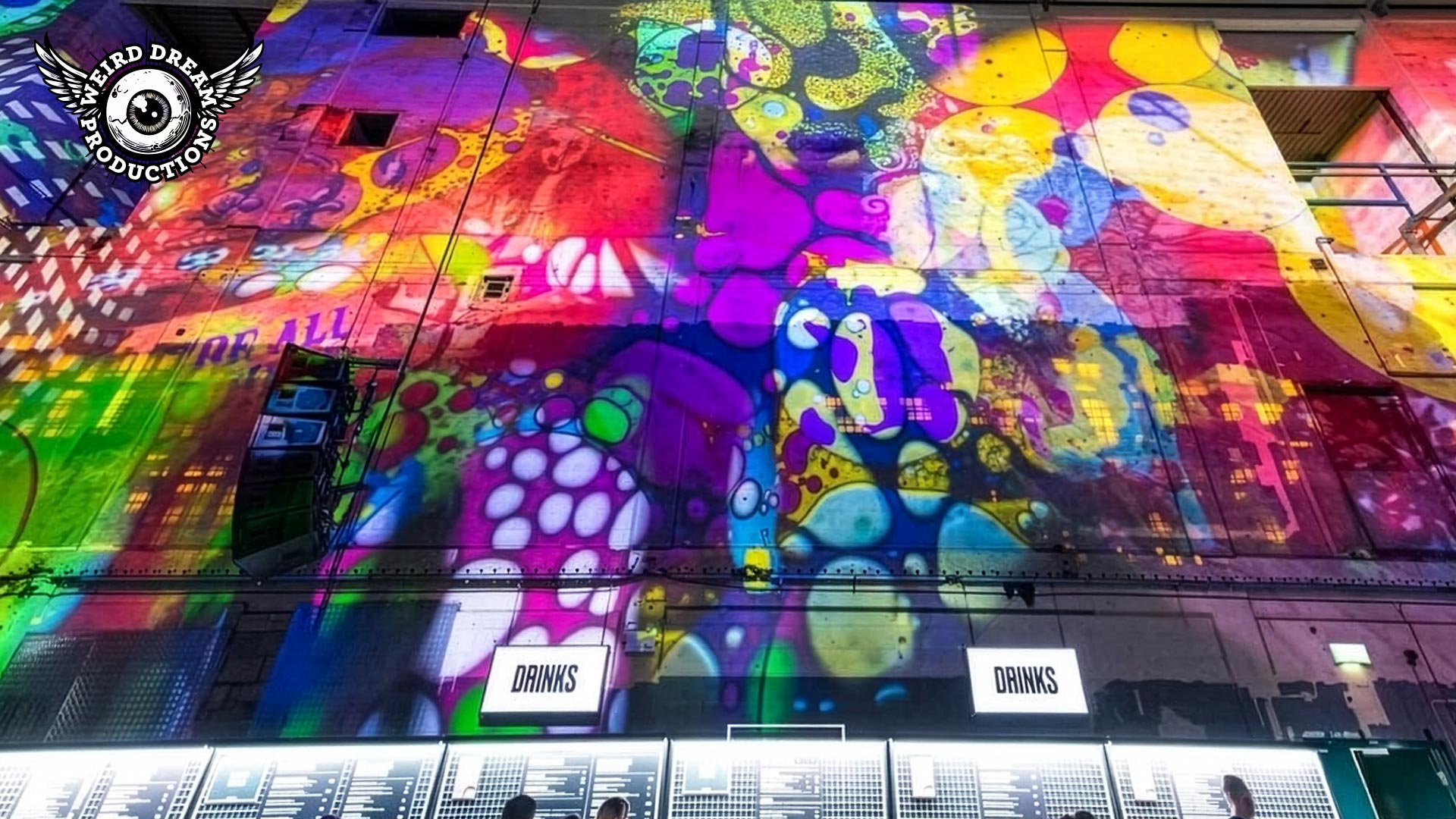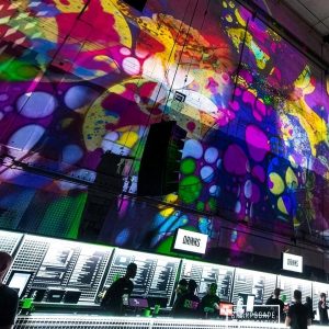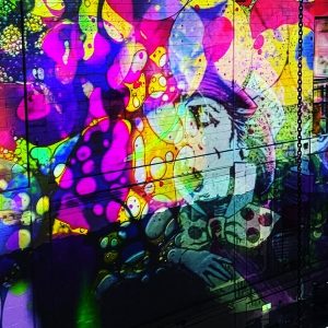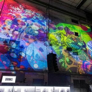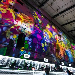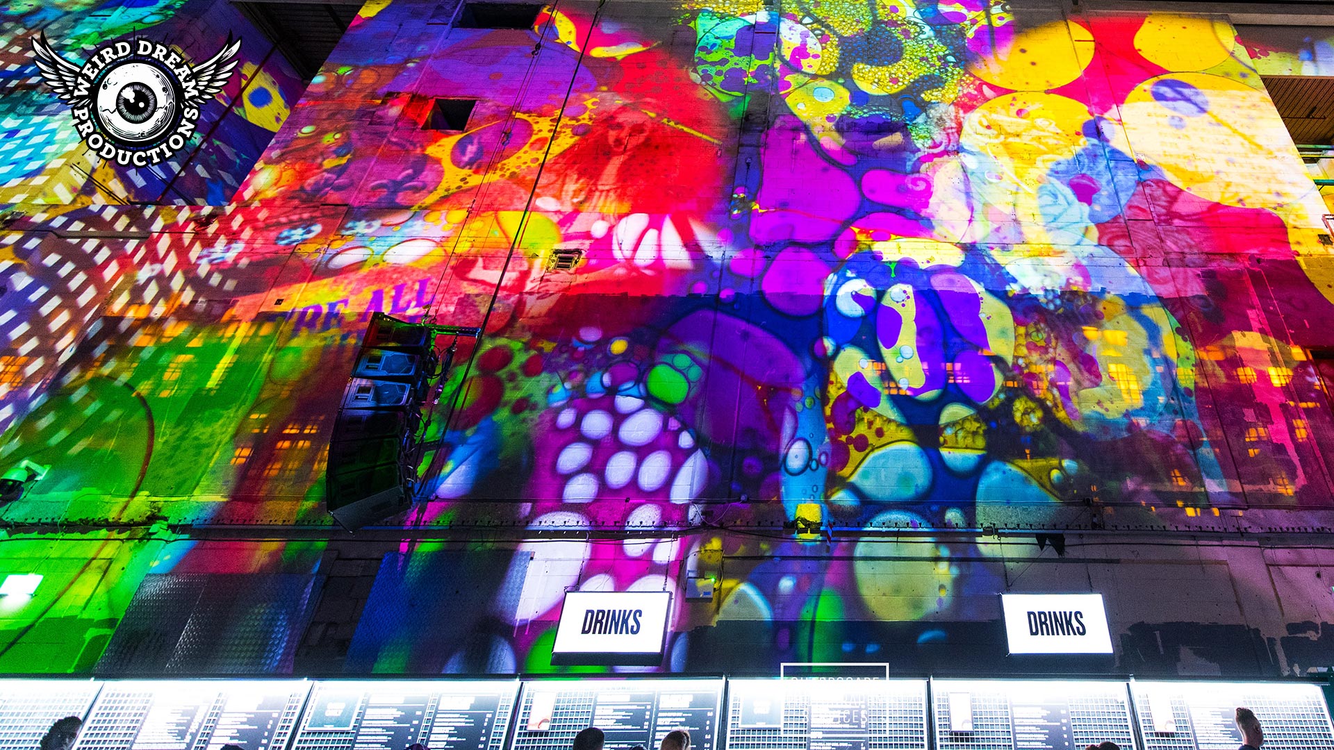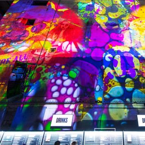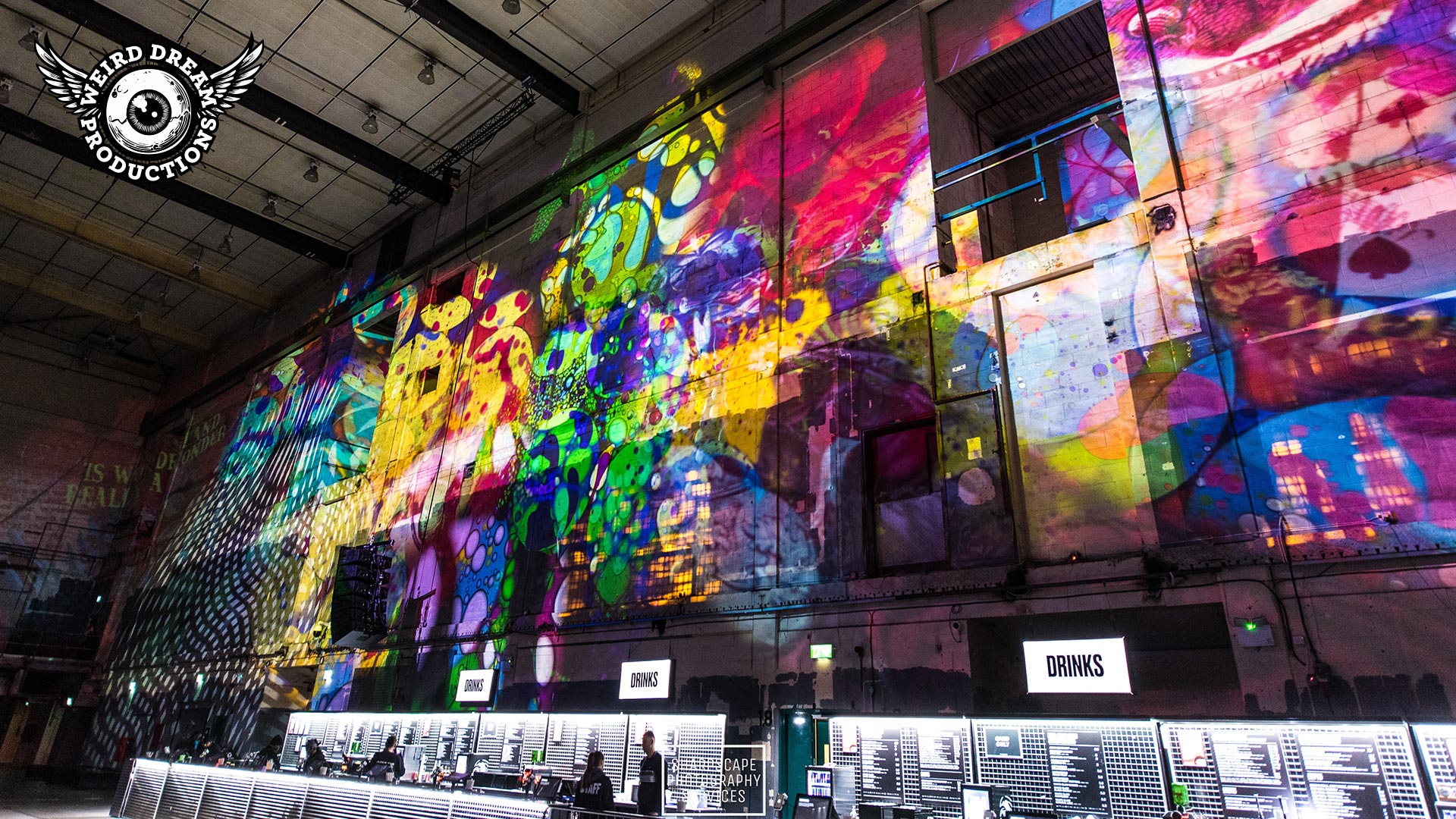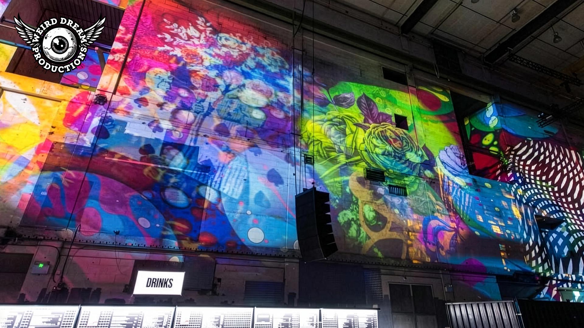 Our mission? Turn industrial grit into full-blown Wonderland. Lava-lamp oil projections spilled across the vast walls, constantly morphing and melting, then collided with scenes from Alice’s Adventures in Wonderland by Lewis Carroll. The result: trippy oils plus Victorian fantasy, blended into one gloriously surreal spectacle.