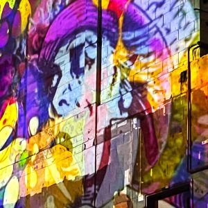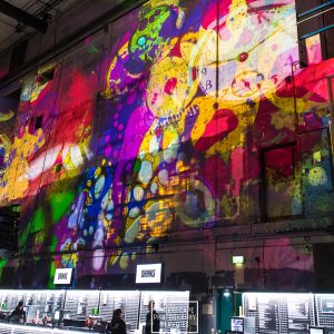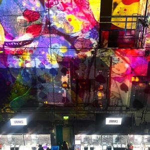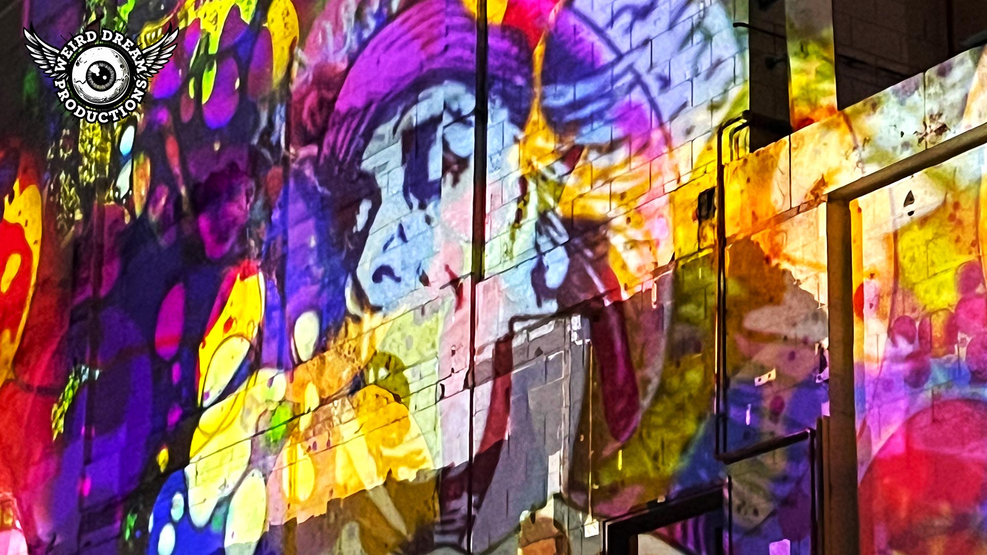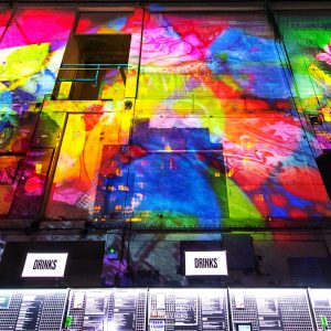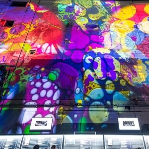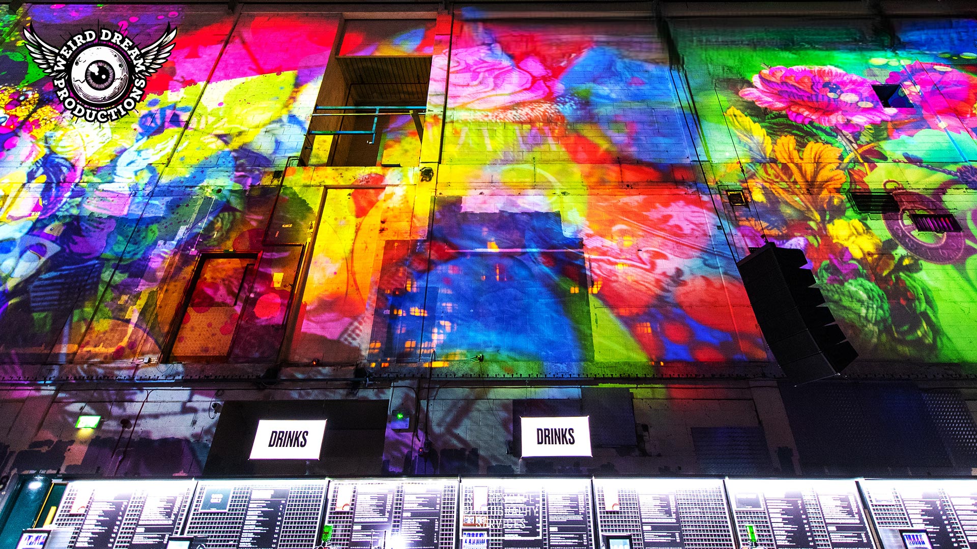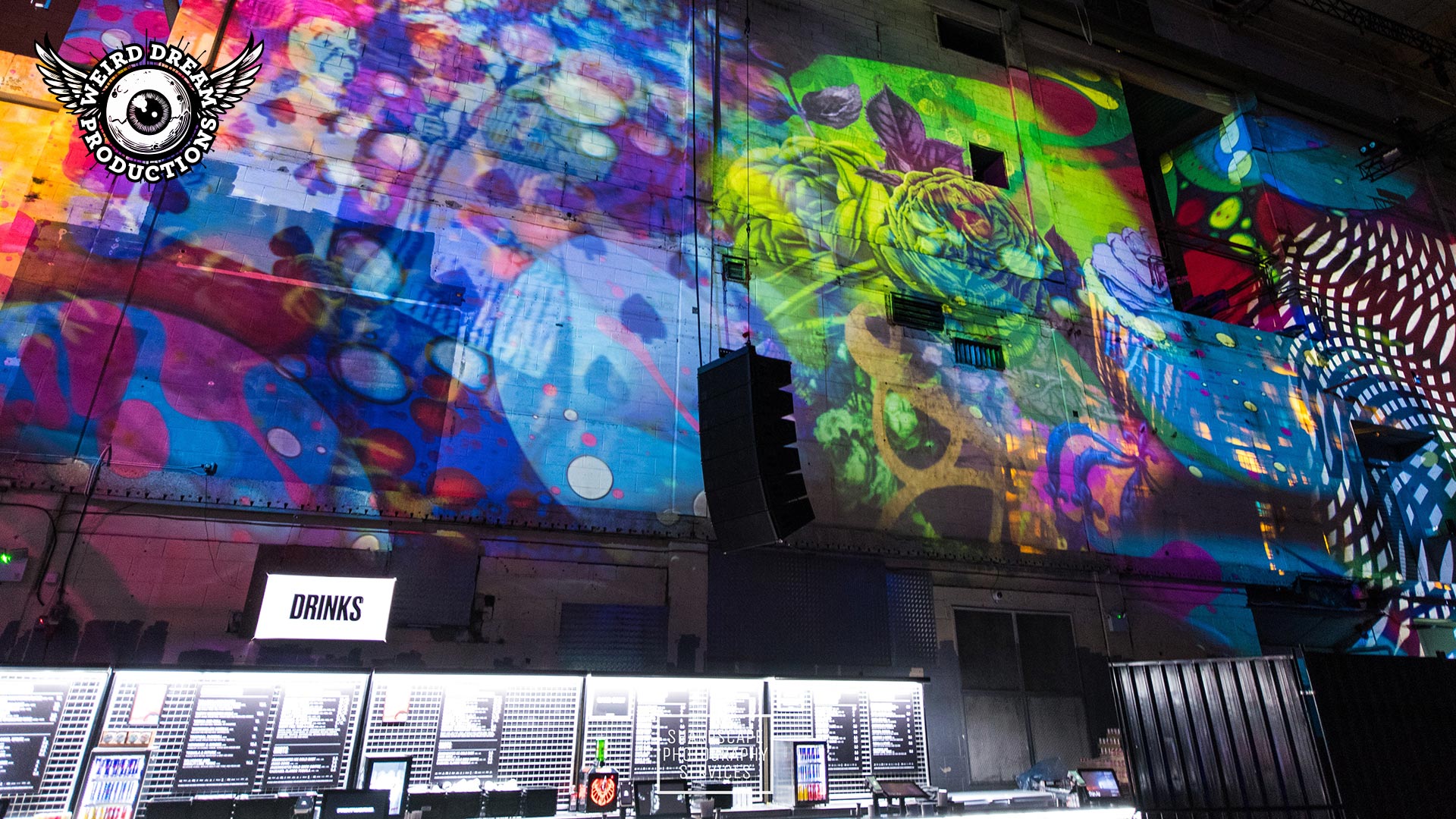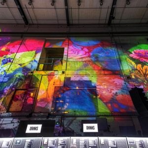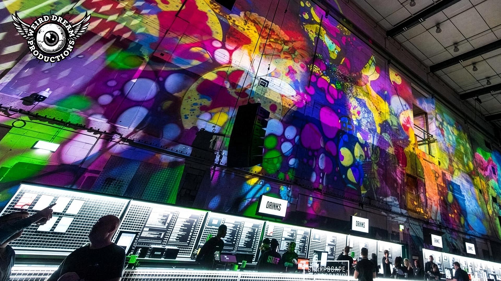 Our mission? Turn industrial grit into full-blown Wonderland. Lava-lamp oil projections spilled across the vast walls, constantly morphing and melting, then collided with scenes from Alice’s Adventures in Wonderland by Lewis Carroll. The result: trippy oils plus Victorian fantasy, blended into one gloriously surreal spectacle.